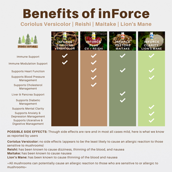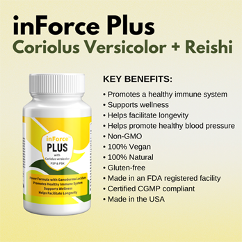 Designed specifically for immune support, Forest Natural only combines the most potent strains of Coriolus Versicolor (more commonly known as Turkey Tail) and Ganoderma Lucidum (more commonly known as Reishi) to create inForce Plus. Both Coriolus Versicolor and Ganoderma Lucidum have been used for holistic purposes in eastern cultures for well over a thousand years. There are hundreds of western style clinical studies suggesting that both Coriolus Versicolor and Ganoderma Lucidum offer a high level of immune support, and many other beneficial properties through Triterpenes and Polysaccharides. Based on these and other studies. Forest Natural utilizes its proprietary extraction processes to create this proprietary blend of the most potent combination for our customers. This product is 100% vegan and bottled in the United States in a FDA registered bottling facility that is CGMP compliant (Current Good Manufacturing Practices).
