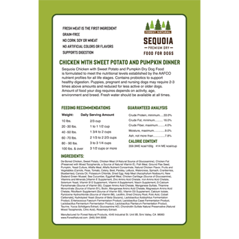 Feed your furry friend this balanced and nutritious meal! The Sequoia Chicken With Sweet Potato Grain-Free Dry Food is crafted with non-GMO premium natural ingredients, including farm-raised chicken. It also features nutritious fruits and veggies, including sweet potatoes, spinach, carrots, cranberries, pumpkin, and blueberries. But the goodness doesn’t stop there, because it also contains New Zealand green mussels, which deliver a powerful source of glucosamine and chondroitin to support healthy joints, reduce inflammation and help restore bone strength. And with chelated vitamins and minerals, plus prebiotics and probiotics, this kibble is paw-fect for digestion and nutrient absorption. This wholesome recipe can be given to dogs of all ages, from puppy to senior.